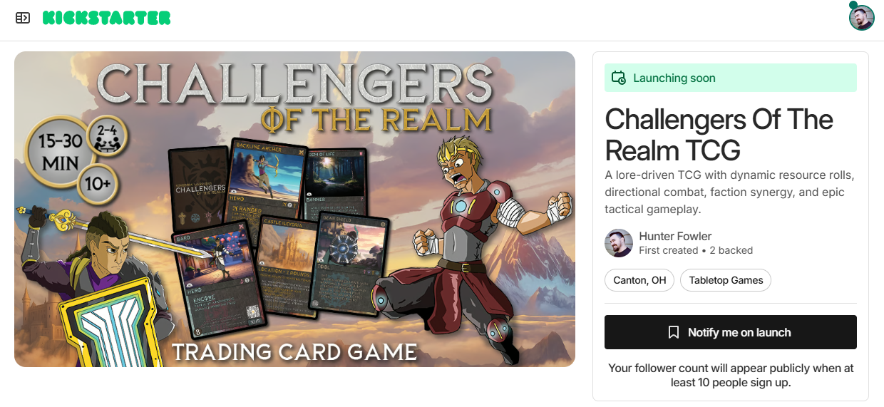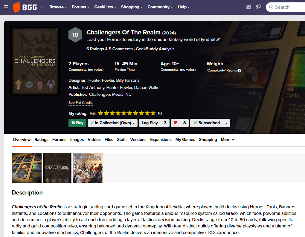 Challengers of the Realm is a strategic trading card game set in the Kingdom of Ileydria, where players build decks using Heroes, Tools, Banners, Instants, and Locations to outmaneuver their opponents. The game features a unique resource system called Grace, which fuels powerful abilities and determines a player’s ability to act each turn, adding a layer of tactical decision-making. Decks range from 40 to 80 cards, following specific rarity and guild composition rules, ensuring balanced and dynamic gameplay. With four distinct guilds offering diverse playstyles and a blend of familiar and innovative mechanics, Challengers of the Realm delivers an immersive and competitive TCG experience.